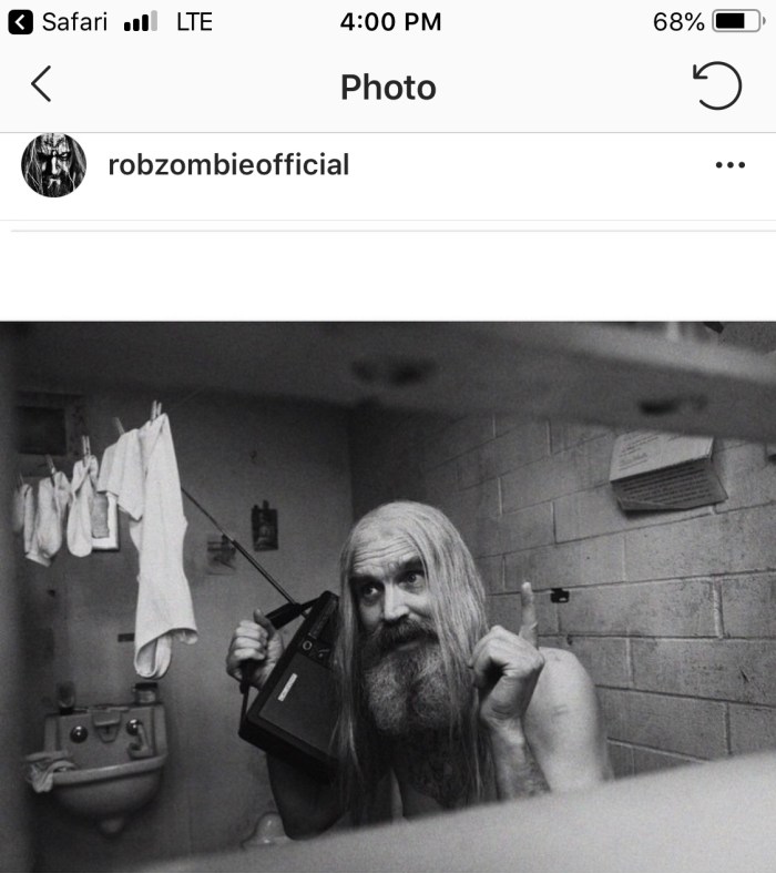 Zombie posted a new photo of Otis B.Driftwood (played by Bill Moseley) enjoying his time behind bars with his radio up to his ear on his official Instagram account.